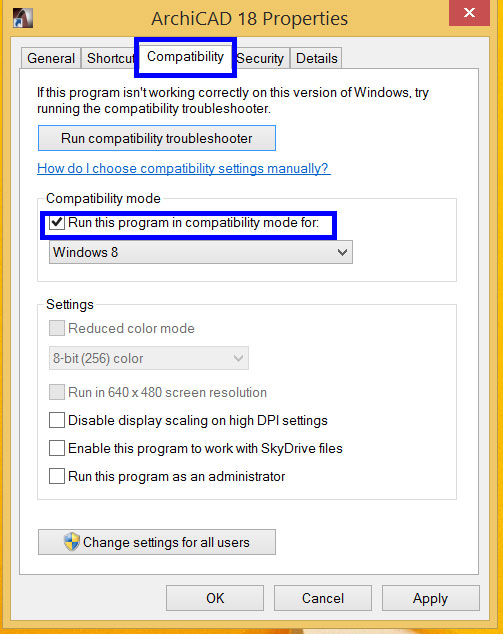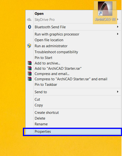 Mirëpo, në rastëse ArchiCAD nuk starton fare, atherë Right-Click në ikonën e ArchiCAD dhe kliko "Properties". Zgjidh kolonën "Compatibility" dhe aktivizo "Run this program in compatibility mode for:"